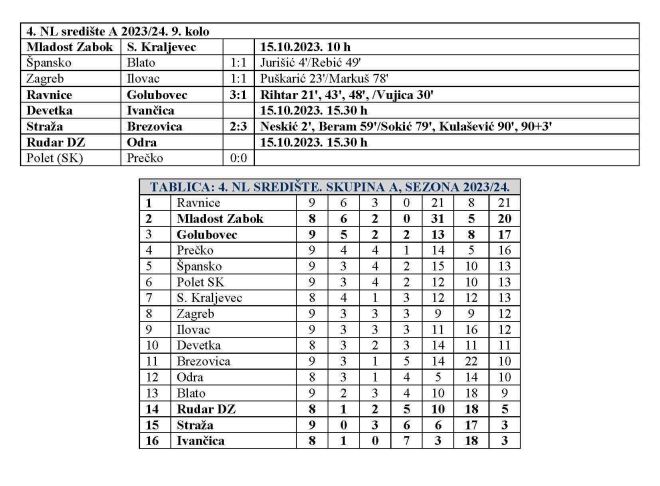 Danas je odigrano pet od osam utakmica 9. kola 4. NL središte skupina A. U dvije su nastupili zagorski predstavnici i u obje su poraženi. Golubovec je poražen kod Ravnica, koje je do 3:1 pobjede hat trickom odveo Filip Rihtar i bar do sutra Ravnice su na čelu. Straža je imala 2:0 do 79. minute, ali nije na kraju uzela niti bod protiv Brezovice u derbiju začelja. U šokantnoj završnici Brezovica je stigla do pobjede i to jako važne pobjede. Preostale današnje utakmice završila se bez pobjednika: Zagreb – Ilovac i Špansko – Blato 1:1, a Polet )SK) – Prečko 0:0. Ravnice vode sa 21 bodom, ali Mladost Zabok se sutra može vratiti na čelo, ako ne izgubi utakmicu protiv Sesvetskog Kraljevca. Sutra će igrati i Rudar DZ, koji dočekuje Odru u jako važnoj utakmici za borbu na dnu, dok će Ivančica na teško gostovanje kod Devetke.