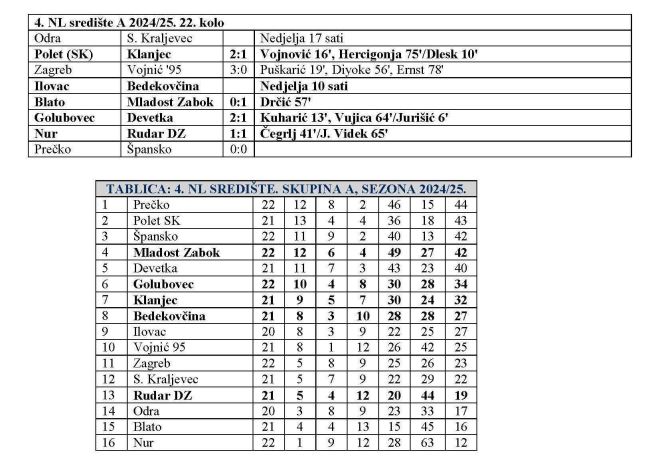 Nastavljeno je danas 22. kolo 4. NL središte skupina A. Iako još nije gotovo, možemo zaključiti, da je to kolo koje je definitivno u igru za sam vrh, za prvo mjesto vratilo Mladost iz Zaboka, koja je stigla do minimalne, ali jako vrijedne pobjede kod Blata 1:0. U derbiju još u petak Prečko i Špansko odigrali su bez golova, a Zabočanima je pomogao i Golubovec, koji je pobijedio 2:1 Devetku. Nije pak pomogao Klanjec, koji je poražen kod Poleta u Svetoj Klari. Bilo je 2:1. No, nakon ovakvog raspleta pet je ekipa u četiri boda. Prečko ima 44, Polet (SK) 43, Špansko i Mladost Zabok po 42, a Devetka 40, s tim da Devetka i Polet imaju po utakmicu manje. Rudar DZ je pak kod zadnjeg Nura odigrao 1:1. Nur je zadnji, no izgleda da Rudar lakše igra sa ekipama iz vrha, jer nedavno je u gostima pobijedio Špansko, pa nakon toga remizirao sa Prečkom. Na ljestvici je trenutno 13. sa 19 bodova i utakmicom manje, no iza njega je Odra sa 17 bodova i dvije utakmice manje, jer ima jednu zaostalu, a sutra igra 22. kolo protiv Sesvetskog Kraljevca u 17 sati. Već ujutro, u 10 sati Bedekovčina gostuje kod Ilovca.
