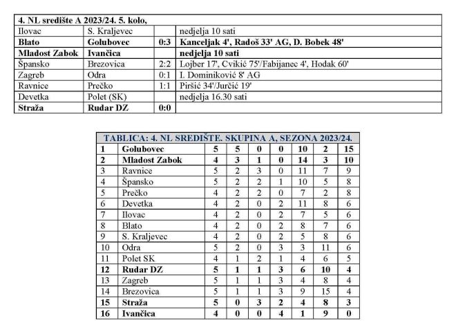 Jučer je odigrano pet utakmica 5. kola 4. NL središte skupina A. Vodeći Golubovec i dalje ruši sve pred sobom. Ovaj puta, za petu pobjedu zaredom palo je Blato i to u Blatu. Bilo je 3:0 za Golubovec koji će tako sa prvog mjesta i maksimalnih 15 bodova dočekati veliki derbi protiv Mladosti iz Zaboka, koji se igra u subotu 23. rujna u 16.30 u Novom Golubovcu. Da bi Mladost na derbi stigla sa samo dva oda manje morat će danas u zagorskom derbiju dobiti zadnju Ivančicu. Utakmica se igra već u 10 sati. A jedan zagorski derbi odigran je jučer. Straža i Rudar DZ igrali su bez golova, s tim da je domaći junak golman Drašković, koji je skinuo penal Cujzeku. Jučer su još dvije utakmice završile bez pobjednika: Špansko – Brezovica 2:2 i Ravnice – Prečko 1:1, dok je Odra kao gost svladala Zagreb 1:0. Danas će u 10 još igrati Ilovac – Sesvetski Kraljevec, dok će kolo zaključiti u 16.30 sati Devetka i Polet (SK).