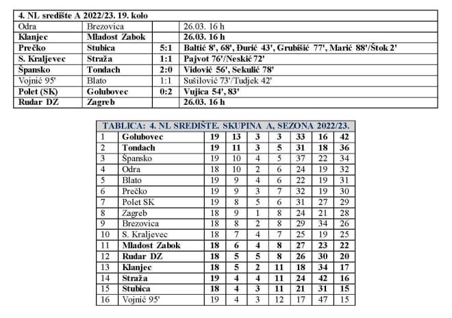 Nakon što je jučer Stubica poražena kod Prečkog, danas su u 20. kolu 4. NL središte – skupina A na terenu bila još tri zagorska predstavnika, a postigli su sva tri rezultata. Vodeći Golubovec stigao je do jako važne pobjede ko Poleta u Svetoj Klari. Vujica je u nastavku sa dva gola donio prva tri gostujuća boda ovog proljeća i učvrstio svoju ekipu na prvom mjestu. Razlika nad Tondachom se i povećala, nakon što je Špansko pobijedilo Tondach sa 2:0. Straža je stigla do vrijednog boda kod Sesvetskog Kraljevca i preskočila Stubicu. Sutra se igra zagorski derbi Klanjec – Mladost Zabok, Rudar DZ dočekuje Zagreb, a igrat će i Odra i Brezovica.