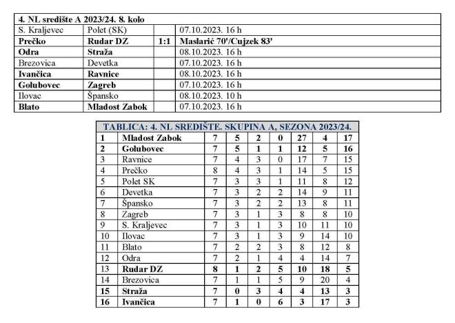 Osmo kolo 4. NL središta skupina A započelo je već u srijedu, kada je Prečko dočekalo Rudar DZ. Nakon šokantnog poraza od Poleta (SK) u 7. kolu samo tri dana kasnije Rudar je išao na teško gostovanje kod Prečkog, ali se vratio sa vrijednim bodom. Danas se igraju četiri, a sutra još tri utakmice. Vodeća dvojka na teren će danas. Mladost Zabok gostovat će kod Blata, a Golubovec dočekuje Zagreb. I jedni i drugi (zagorski predstavnici) traže nove pobjede. Sutra će pak Ivančica dočekati Ravnice, dok će Straža gostovati kod Odre. Tu je pak u pitanju sa zagorske strane borba za opstanak i svaki bod je važan. Evo svih parova i aktualne ljestvice.