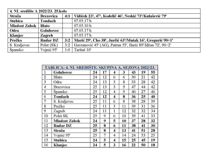 U 25. kolu 4. NL središte skupina A Straža je dočekala Brezovicu. Bila je to druga uzastopna domaća utakmica Straže, težak izazov protiv Brezovice, koja ima najbolji proljetni učinak, sa samo jednim remijem i to kolo prije ovoga, kod kuće protiv Vojnića '95. No, već u najavi utakmicu u Humu na Sutli nisi skrivali optimizam i vjeru da mogu. Od samog početka to su pokazivali i na terenu, a u 23. minuti je igrač sa brojem 23. Borna Vidićek zabo za 1:0. Sa tim se rezultatom otišlo na odmor. Drugo poluvrijeme započelo je baš pravim šokom za goste i praktički rješenjem utakmice u samo dvije minute. Naime, odmah u 46. minuti Jan Kodelič ja doveo Stražu do 2:0, da bi već u 47. minuti Vidićek svojim drugim golom povisio na 3:0. Svaku dvojbu, ako ih je uopće i bilo riješio je Alen Neskić u 73 minuti golom za 4:0. Fran Kulašević je u 79. ipak zabio počasni gol za konačnih 4:1. Velika pobjeda Straže protiv ekipa, kojoj je to prvi proljetni poraz. Već u srijedu Stražu čeka veliki zagorski derbi kod Tondacha, a slijedeće subote opet poziv navijačima na novu domaću utakmicu, protiv još jedne ekipe iz vrha – Blata.