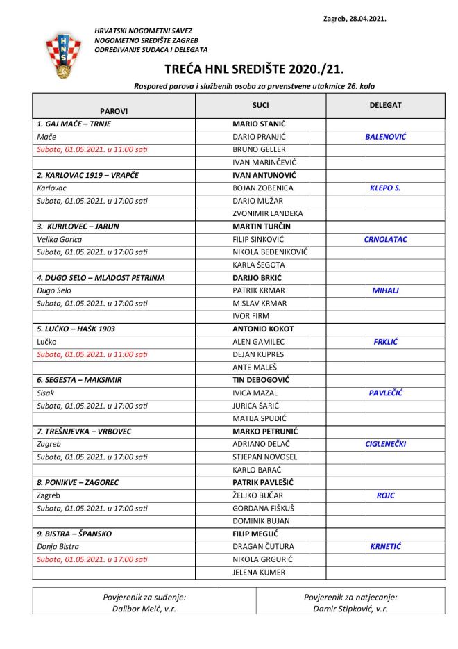 Dogovorom dvaju klubova utakmica 26. kola III. HNL-središte između domaćeg Gaja i Trnja odigrat će se na Praznik rada, sutra u 11 sati, a ne kako je to prvobitno bilo zamišljeno u nedjelju 2.5. u istom terminu. Tako će se kompletno 26. kolo odigrati u subotu 1.5. jer je i Bistra svoju utakmicu prebacila na sutrašnji dan, s time da će Bistrani Špansko dočekati u 17 sati. U isto će se vrijeme u Gajnicama susresti Ponikve i Zagorec.