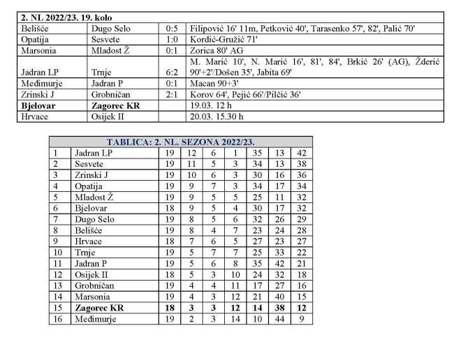 U SuperSport 2. NL Zagorec će sutra gostovati kod Bjelovara. Još će se jedna utakmica odigrati u ponedjeljak, a mi vam donosimo rezultatski pregled kola i ljestvicu.