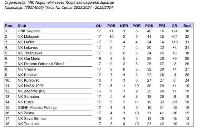 Izvjesno je da je Segesta jesenski prvak, ali zbog dva odgođena meča Gaj Mače - Zagorec KR i Kurilovec - Sava Strmec moguće se promjene na ljestvici. Gaj bi čak u slučaju pobjede protiv Zagorca KR mogao na diobu drugog, točnije na treće mjesto na kraju jesenskog dijela prvenstva. Remi bi Gaju donio petu, a Zagorcu KR jedanaestu poziciju, dok bi u slučaju pobjede Zagorca KR Gaj ostao šesti, a Zagorec KR bio bi jedanesti na kraju jesenskog dijela.