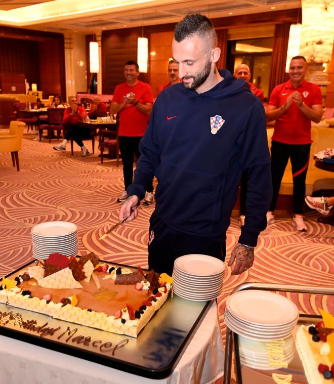 "Nakon ogleda sa Saudijskom Arabijom, svoj 30. rođendan u društvu reprezentativnih suigrača proslavio je neumorni Marcelo Brozović - želimo mu da poslije rođendana nastavi slaviti hrvatske pobjede na WorldCup", objavio je HNS.