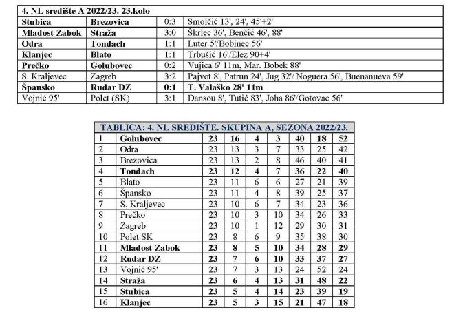 Odigrano je 23. kolo 4. NL središte skupina A. Počelo je još u petak, kada je vodeći Golubovec slavio sa 2:0 kod Prečkog i na vrhu stigao do čak deset bodova prednosti. Sada ima 52 boda, a druga Odra 42. U tome mu je pomogao Tondach, koji se diže nakon kriza pa je odigrao baš kod Odre 1:1. No, ipak je pao na četvrto mjesto sa 40 bodova, jer je Brezovica stigla do nove pobjede sa 3:0 kod Stubice i već je treća sa 41 bodom. Ima sve proljetne pobjede. U zagorskom derbiju kola Mladost je u Zaboku svladala Stražu sa 3:0 i zadržala je 11. mjesto sa 29 bodova, ali se na bod približila Poletu (SK). I Rudar DZ je bio odličan te je sa 1:0 slavio kod Španskog i drži 12. mjesto sa 27 bodova. Klanjec je pak dočekao Blato i vodio 1:0 sve do četvrte minute nadoknade kada je ostao bez dva vrijedna boda, pa je i dalje zadnji, sada sa 18 bodova. Stubica ima bod više, a Straža četiri više, ali je i nju preskočio, na proljeće preporođeni Vojnić '95. U 24. kolu čekaju nas čak tri zagorska derbija. Tako će se u subotu u 17 sati sastati Tondach – Mladost Zabok i Straža – Stubica, dok će u nedjelju u 17 sati igrati Golubovec i Klanjec. U nedjelju će igrati i Rudar DZ koji dočekuje Sesvetski Kraljevec.
