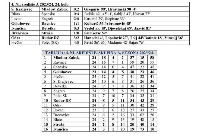 Odigrano je 24. kolo 4. NL središte Skupina A. Vrlo je uzbudljivo bilo u subotu kada su se u isto vrijeme igrale dvije utakmice, dva derbija vrlo važna za borbu za naslov, a u oba je sudionik bio po jedan zagorski predstavnik. Vodeća Mladost iz Zaboka je u završnici stigla do iznimno važne pobjede kod Sesvetskog Kraljevca. Sve do 88. minute bilo je 0:0, a onda je Tin Gregurić pogodio za 0:1, da bi Karlo Hrastinski, duboko u nadoknadi potvrdio pobjedu, koja je još više dobila na značenju, kada je završila i derbi utakmica u Novom Golubovcu, u kojoj je Golubovec igrao 1:1 protiv Ravnica. Bod mu je premalo za povratak u borbu za naslov, ali dobro je došao Zabočanima, koji sada bježe tri boda Ravnicama (58-55), dok je Golubovec na četvrtom mjestu sa 46 bodova, ali i utakmicom manje. Straža je pak imala važan derbi začelja kod Brezovice. Pobjedom bi otvorila vrata borbi za opstanak, no slavila je Brezovica 1:0 i odvojila sa na šest bodova. Straža je ostala predzadnja sa 14 bodova, a Ivančica je i dalje zadnja sa deset bodova, nakon novog domaćeg poraza, ovaj puta od Devetke 0:3. Rudar DZ je pak poražen kod Odre, koja je slavila 3:2. Ostao je na desetom mjestu sa 29 bodova. 25. kolo donosi zagorski derbi začelja, u kojem će Straža dočekati Ivančicu. Mladost Zabok će na novo teško gostovanje, kod Španskog, a Golubovec gostuje kod Devetke. Sve te utakmice igraju se u subotu u 17 sati. Kolo će završiti Rudar DZ, koji u nedjelju dočekuje Brezovicu. Prva utakmica kola je već u petak, kada Prečko dočekuje Sesvetski Kraljevec. A u subotu još igrahu Polet (SK) – Odra, Ravnice – Ilovac i Zagreb Blato.