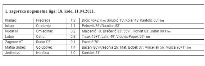 Odigrane su utakmice 18. kola 1. zagorske nogometne lige. Nakon što je na Uskrsni ponedjeljak preuzeo vodstvo na ljestvici, Golubovec ga je nakon ovog kola i povećao, nakon pobjede 4:1 kod Matije Gupca i poraza Klanjca u Kumrovcu od Pregrade 1:3. Sada se Jedinstvo približilo na 2 boda Klanjcu, nakon 1:0 protiv Ivančice. Istim rezultatom slavio je Rudar DZ kod Zagorca VT, Oštrc je sa 3:0 pobijedio Lobor u gostima, ali na svom igralištu, a Rudar M je sa 3:2 bio bolji od Omladinca. Jedina utakmica bez pobjednika odigrana je u Poznanovcu, gdje su Inkop i Oroslavje igrali 1:1.