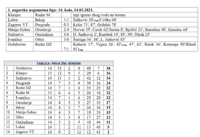 Utakmicama 14. kola počeo je proljetni dio 1. ŽNL. Golubovec je s visokih 7:1 pobijedio Rudar DZ i preuzeo vodstvo, jer vodeći Klanjec nije odigrao susret protiv Rudara M, zbog vode na igralištu u Kumrovcu, gdje će Klanjec igrati domaće utakmice ovoga proljeća. Donosimo i ostale rezultate i ljestvicu.