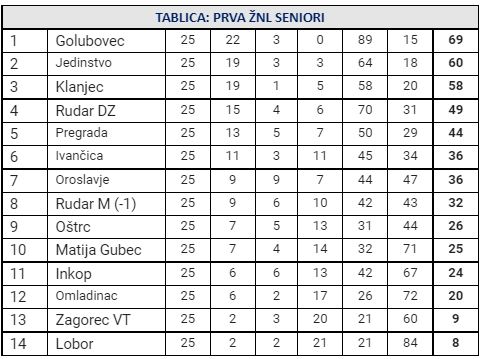 Jučer je odigrano 25. kolo 1. zagorske nogometne lige. Kako je već kolo prije Golubovec osigurao naslov prvaka, pehar im je dodijeljen na zadnjoj domaćoj utakmici. Nakon dodjele Golubovec je sa 6:1 pobijedio Omladinac, za najuvjerljiviju pobjedu kola, u kojoj su čak 4 utakmice završile bez pobjednika. Osim Golubovca slavili su Rudar DZ protiv Oštrca 3:0 i Klanjec kod Lobora 3:1. Zagorec VT je odigrao 2:2 protiv Rudara M i time opet vratio prednost pred Loborom u borbi za opstanak. Jedinstvo i Pregrada igrali su 0:0, a taj je rezultat otvorio borbu za 2. mjesto u zadnjem kolu, a to mjesto vodi u 4. NL središte. Klanjec ima bolji međusobni omjer ove sezone i dva boda zaostatka za Jedinstvom. U zadnjem kolu Jedinstvo će na teško gostovanje u Oroslavje, a Klanjec će u Kumrovcu dočekati još težeg protivnika, Rudar DZ. Dva derbija susjeda na ljestvici završila su bez pobjednika. Ivančica i Oroslavje igrali su 0:0, dok je Inkop u Gornjoj Stubici vodstvo Matije Gubca na poluvremenu od 3:0 pretvorio u 3:3. Donosimo sve jučerašnje rezultate, strijelce i ljestvicu.