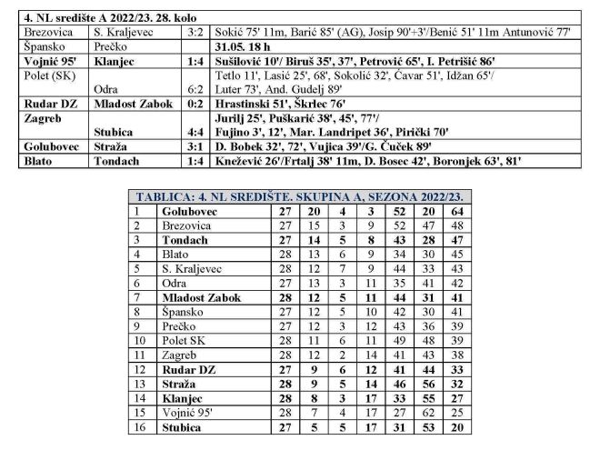 Iza nas je 28. kolo 4. NL središte skupina A. S obzirom da je prvak već poznat i da je to Golubovec, možda je ipak za zagorski nogomet najvažnije iz ovoga kola to što se Klanjec vratio u igru. Naime, Klanjec je sa 4:1 slavio kod Vojnića '95 i u izravnoj borbi za izbjegavanje predzadnjeg mjesta napravio važan korak, jer sada ima prednost od dva boda, dva kola prije kraja. 14. mjesto jako je važno, jer bi moglo donijeti opstanak, iako je to još uvijek komplicirana računica i ovisi o raspletima liga iznad. Stubica je pak odigrala 4:4 kod Zagreba, što je dobar bod, ali nažalost teško da će biti dovoljan da su uhvati opstanak. Tondach je pak stigao do lijepe pobjede 4:1 kod Blata pa se ozbiljno vratio u borbu za drugo mjesto na kraju sezone. U nedjelju su odigrana dva zagorska derbija. Golubovec je sa 3:1 pobijedio Stražu i samo potvrdio naslov, za koji je već i dobio pehar, iako se prava službena fešta očekuje 3. lipnja nakon zadnjeg kola. Mladost Zabok je pak u gradskom derbiju slavila kod Rudara DZ sa 2:0. Na ljestvici uvjerljivi Golubovec ima 64 boda, a Brezovica 48. Tondach je na trećem mjestu sa bodom manje. Mladost Zabok je već sedma sa 41 bodom, Rudar DZ je nas 12. mjestu sa 33, a Straža na 13. sa 32 boda. Klanjec je sada 14. sa 27 bodova, dva više od Vojnića '95, dok je Stubica zadnja sa 20 bodova. Pretposljednje 29. kolo donosi dva zagorska derbija. U Bedekovčini Tondach dočekuje vodeći Golubovec, a Stubica će biti domaćin Rudaru DZ. Mladost će u Zaboku dočekati Polet (SK), Straža Zagreb, a Klanjec je domaćin Španskom. Sve bi se utakmice trebale igrati u isto vrijeme, u subotu 27. svibnja u 18 sati, no vidjet ćemo hoće li neke koje više ne odlučuju o ničemu možda i promijeniti termin. No i prije toga, u srijedu odigrat će se tri zaostale utakmice 27. kola. U zagorskom derbiju Stubica dočekuje Golubovec, dakle to je ogled zadnje protiv prve ekipe. Tondach će dočekati Brezovicu u borbi za drugo mjesto, a Rudar DZ gostuje kod Odre. Utakmice u srijedu počinju u 18 sati.