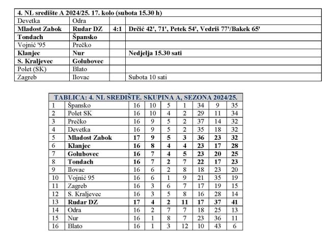 Krenulo je 17. kolo 4. NL središte skupina A, u kojoj se natječe i pet zagorskih klubova. Prva utakmica odigrana je sinoć i to zagorski i gradski derbi između Mladosti Zabok i Rudara DZ. Slavili su domaćini sa 4:1.
