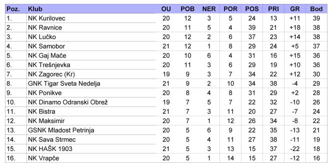 Zagorski klubovi imali su polovičan uspjeh u 21. kolu III. NL-centar. U subotu je Zagorec KR poražen u gostima kod Samobora, dok je Gaj u nedjelju na svom travnjaku savladao Savu Strmec. Bilo je ovo teško kolo za tri prvoplasirane momčadi. Nakon niza od četiri pobjede Lučko je samo remiziralo u gostima kod pretposljednjeg HAŠK-a, Ravnice su uzele samo bodu u Petrinji protiv Mladosti, dok je Kurilvoec poražen kod kuće od sve bolje Trešnjevke. U derbiju sredine ljestvice Tigar SN uzeo je sva tri boda kod Ponikvi, a veliki posao napravila je Bistra koja je slavila protiv posljednje momčadi Vrapča. Važnu je gostujuću pobjedu za bijeg iz opasne zone ostvario Maksimir u gostima kod Dinama OO.