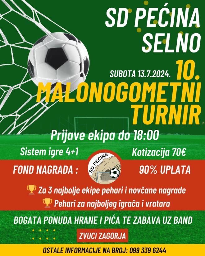 Sportsko društvo "Pećina" Selno koje djeluje na području naselja Selno (Općina Krapinske Toplice) organizira 10. malonogometni turnir.