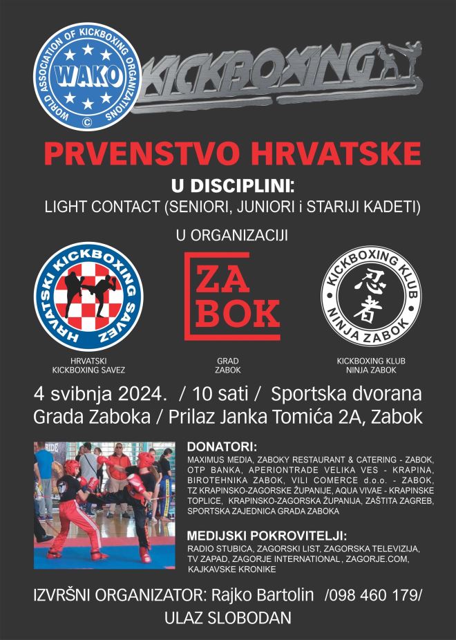 U organizaciji Hrvatskog kickboxing saveza, Grada Zaboka i Kickboxing kluba Ninja Zabok, 4. svibnja će se u Sportskoj dvorani u Zaboku održati prvenstvo Hrvatske u light contact disciplini za seniore, juniore i starije kadete.