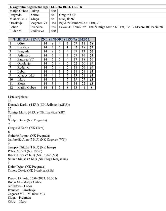 Odigrano je 14. kolo 1. zagorske nogometne lige, nakon kojega imamo novu ekipu na vrhu. Naime u derbiju Oštrc je slavio 1:0 kod Pregrade i tako ju preskočio na ljestvici, sada sa 28 bodova. Do nove pobjede, 4:2 kod Lobora stigla je Ivančica i probila se na drugo mjesto sa 27 bodova, dok je Pregrada pala na treće sa 26 bodova. Jedinstvo je odigralo 0:0 kod Rudara M i ostalo je četvrto sa 25 bodova. Još u subotu Zagorec VT je sa 2:1 slavio kod Oroslavja i probio se na peto mjesto sa 20 bodova. Po 19 bodova imaju Oroslavje i Rudar M, a na osmom mjestu je Lobor sa 15 bodova, koliko ima i deveta Mladost MB nakon 0:1 poraza doma od Sloge. Matija Gubec i Inkop igrali su bez golova, pa je Inkop deseti sa 13 bodova, koliko ima i Sloga, a Matija Gubec na dnu ima 8 bodova. Zanimljivo da u ovom kolu domaćini nisu upisali ni jednu pobjedu. U 15. kolu derbi se igra u Zlatar Bistrici, gdje Ivančica dočekuje Oroslavje. Pregrada gostuje kod Sloge, a Oštrc dočekuje Inkop, dok će Jedinstvo biti domaćin Loboru. U važnim utakmicama za opstanak Zagorec VT dočekuje Mladost MB, a Rudar M Matija Gubec. Utakmice se igraju u nedjelju 16. travnja s početkom u 16.30 sati.