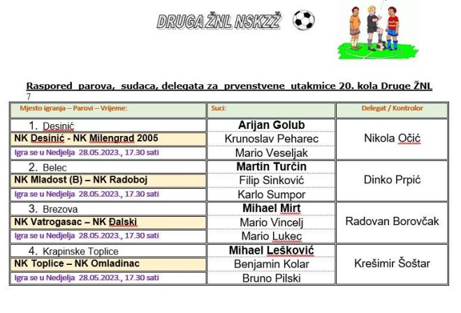 I u 2. zagorskoj ligi danas može teoretski doći do odluke o prvaku. U 20. kolu čeka nas derbi u Belcu, u kojem Mladost dočekuju vodeći Radoboj. Radoboju je dosta bod za naslov i promociju u prvu ligu. U drugim utakmicama Desinić će dočekati Milengrad 2005., a Vatrogasac Đalski, dok će Toplice biti domaćin Omladincu. Utakmice počinju u 17.30 sati.
