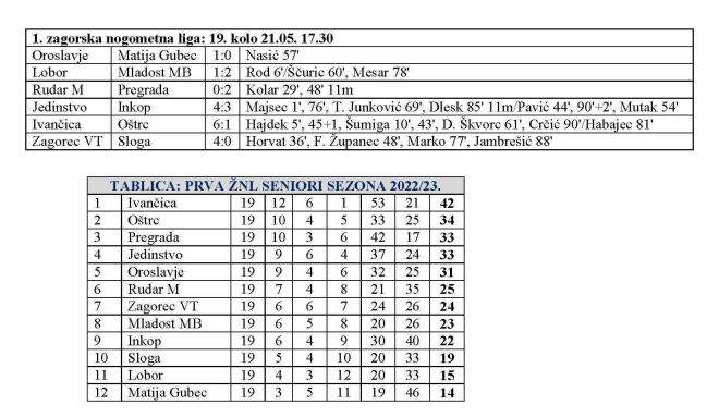 Dovršeno je 19. kolo prve zagorske lige. Naime, prvu utakmicu odigrana je još u subotu 13. svibnja. Podsjećamo Zagorec VT je stigao do važne pobjede protiv Sloge 4:0. Ostatak kola odgodila je kiša. Ivančici odgoda nije smetala, jer je u derbiju dočekala drugi Oštrc. No, Oštrc kao da nije stigao na derbi, od prve minute sva je voda tekla na mlin ekipe koja igra savršeno proljeće pa je i glavni derbi riješila sa čak 6:1. Ivančica je sada otišla na 42 boda, osam više od Oštrca i već u slijedećem kolu može i teoretski osigurati naslov. Sasvim zasluženo. Treće mjesto zadržala je Pregrada nakon 2:0 kod Rudara M, a četvrto Jedinstvo nakon 4:3 protiv Inkopa. Imaju po 33 boda. Slavilo je i Oroslavje, 1:0 protiv Matije Gupca i drži peto mjesto sa 31 bodom. I to završava priča o sasvim sigurnom ekipama za opstanak. Naime, nije sasvim sigurno ni deveto mjesto, jer ovisno o raspletima u višim ligama, može se teoretski dogoditi da ispadaju i četiri ekipe. A od 6. do 9. mjesta su smao tri boda. Rudar M je šesti sa 25 bodova, Zagorec VT ima 24, a Mladost MB je važnom pobjedom kod Lobora 2:1 stigla na osmo mjesto sa 23 boda. Inkop je sada deveti sa 22 boda. U jako teškoj situaciji je Sloga na 10. mjestu sa 19 bodova, a u jako jako blizu 2. ligi su Lobor sa 15 i Matija Gubec sa 14 bodova. U 20. kolu Ivančica ide po potvrdu naslova u Konjščinu kod Sloge, a derbi u borbi za drugo mjesto igrat će Oštrc i Jedinstvo. Pregrada će dočekati Lobor, a Oroslavje gostuje kod Mladosti MB. Vrlo važnu utakmicu za siguran opstanak igraju Inkop i Rudar M, a Zagorec VT će kod zadnjeg Matije Gupca pokušati osigurati svoj siguran status. Utakmice se igraju u nedjleju 28. svibnja u 17.30 sati, osim one u Mariji Bistrici, koja počinje u 16 sati.