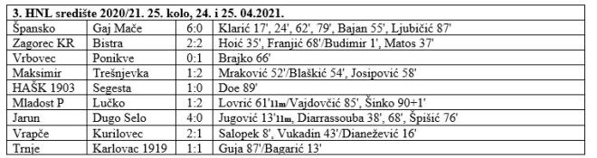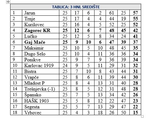 Danas je odigrana i posljednja utakmica 25. kola 3. HNL središte. Podsjetimo zagorsku su predstavnici igrali jučer. Gaj je doživio težak poraz u Španskom. Bilo je 6:0 za domaćine, dok je Zagorec u Krapini odigrao 2:2 protiv Bistre. Za danas je ostala važna utakmica za sam rasplet na vrhu. Trnje je dočekalo Karlovac, a pobjedom bi se poravnalo sa Jarunom na prvom mjesto. No, na kraju je Trnje spašavalo bod, jer je Karlovac vodio od 13. minute golom Bagarića, a u 87. izjednačio je Guja. Tako je Jarun ostao sam na vrhu sa 57 bodova, dva više od Trnja i 5 više od Kurilovca, koji nikako da zaustavi negativnu seriju. U ovom kolu poražen je u Vrapču. To mu je ukupno 5. poraz, ali 3. u nizu, nakon boda u Maču. U 26. kolu u Mače dolazi Trnje, dok će Zagorec na gostovanje Ponikvama.