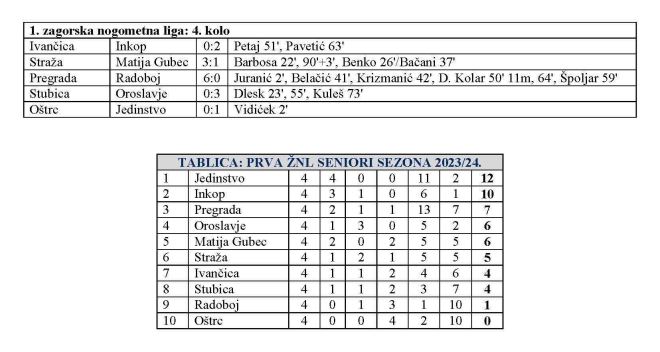 Odigrano je i 4. kolo 1. zagorske nogometne lige. Vodeće Jedinstvo je gostovalo kod zadnjeg Oštrca i stiglo do pobjede, ali sam minimalnih 1:0 i to golom već iz druge minute. Tako Jedinstvo vodi sa maksimalnih 12 bodova. Inkop je stigao do druge uzastopne pobjede u gostima, treće ukupno, jer je sa 2:0 slavio kod susjedne Ivančice u Zlatar Bistrici. Inkop drži drugo mjesto sa deset bodova. Pregrada je sa čak 6:0 pobijedila Radoboj i probila se na treće mjesto sa sedam bodova. U susjedskom derbiju Oroslavje je kao gost svladalo Stubicu 3:0 i drži četvrto mjesto sa šest bodova, koliko ima i Matija Gubec na petom mjestu, nakon drugog poraza u sezoni. Naime, sa 3:1 bolja je bila Straža, koja je tom pobjedom stigla na šesto mjesto sa pet bodova. Ivančica i Stubica imaju po četiri boda, na sedmom i somom mjestu, Radoboj je deveti sa jednim bodom, dok Oštrc i dalje nema niti jedna bod. U 5. kolu vodeće Jedinstvo dočekat će Ivančicu u derbiju kola. Zanimljiva utakmica igra su u Gornjoj Stubici gdje će Matija Gubec dočekati Pregradu. U Poznanovcu Inkop dočekuje Stražu, Radoboj će biti domaćin Stubici, dok će Oroslavje dočekati Oštrc. Utakmice se igraju u nedjelju 22. rujna u 16.30 sati.