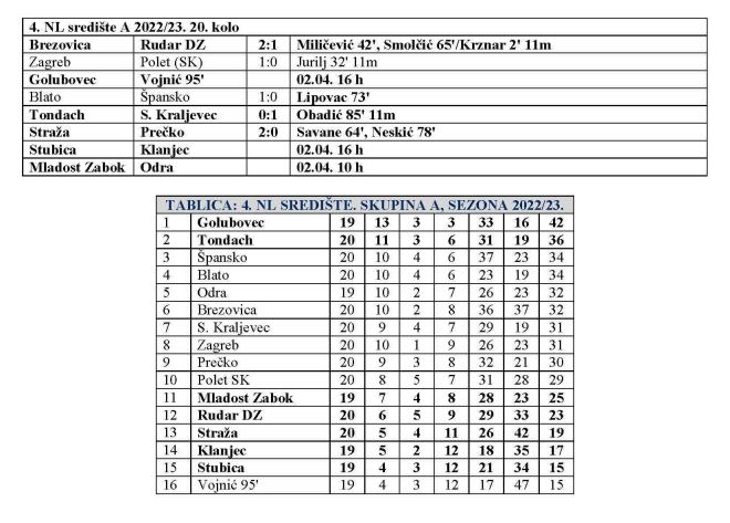 U 20. kolu 4. NL središte – skupina A, danas su na teren izašla tri zagorska kluba. I dok su Tondach i Rudar DZ poraženi, Straža je došla do iznimno vrijedne pobjede, 2:0 kod kuće protiv Prečkog, pa je privremeno preskočila Klanjec na ljestvici. Tondach pak nikako da uhvati formu, te je doživio već treći proljetni poraz. Ovaj puta u Bedekovčini je slavio Sesvetski Kraljevec sa 1:0 i prekinuo niz domaće nepobjedivosti Tondacha još od 27. studenoga 2021. kada je, zanimljivo istim rezultatom u Bedekovčini slavila Stubica. Rudar DZ je pak poražen kod Brezovice. Bilo je 2:1 za domaćine, koji imaju jedini svih pet proljetnih pobjeda i jure prema vrhu tablice. Da Tondach i dalje ostane na drugom mjestu pobrinulo se Blato, koje je sa 1:0 pobijedio Špansko, dok je Zagreb istim rezultatom svladao Polet. Sutra na treće mjesto može Odra, ali za to bi trebala pobijediti u Zaboku Mladost na matineji u 10 sati. U 16 sati je pak na rasporedu zagorski derbi Stubica – Klanjec, dok vodeći Golubovec dočekuje zadnji Vojnić '95 i ima priliku pobjeći na velikih 9 bodova Tondachu.