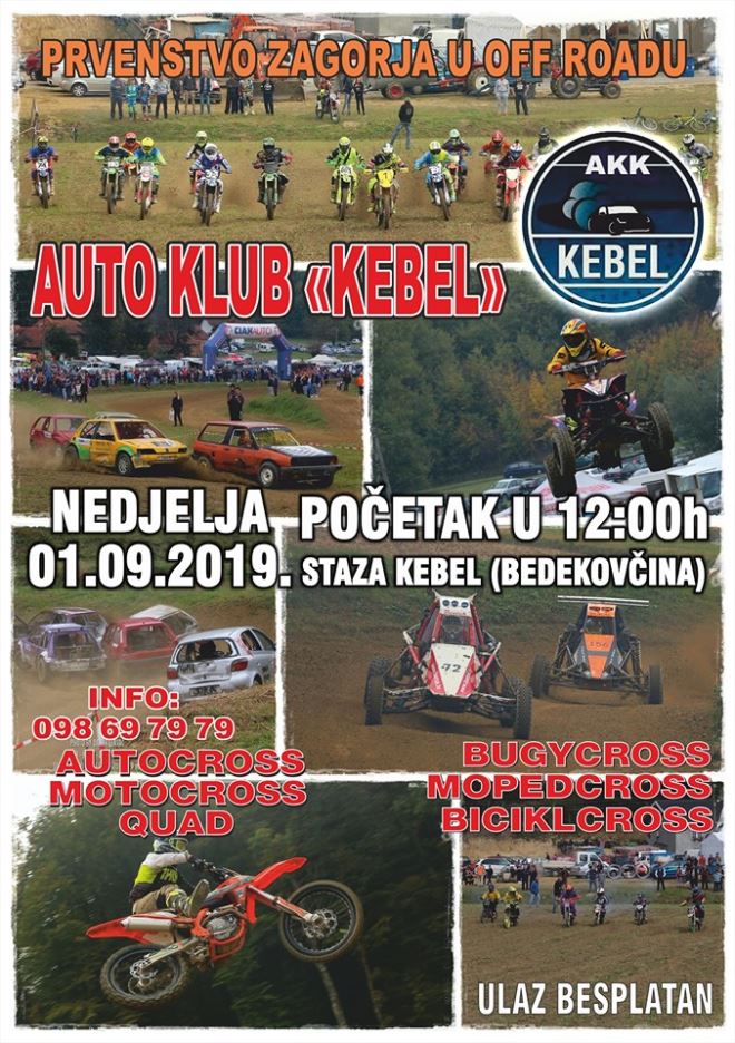 U organizaciji AK Kebel u nedjelju 1.9. u Keblu će se održati utrka Prvenstva Zagorja u off-road disciplinama. Uz vozače autocrosa tu će se naći i brojni vozači motokrosa, quada, buggya, mopeda, a posebno će na biti zanimljivo na djelu vidjeti vozačice i motokrosistice koje su uvijek dobro došle u Kebel. Ovo je drugi puta ove sezone da je Kebel domaćin utrke PZ, a utrke u Keblu najbolje su organizirane u cijelom ovom serijalu. Na prošloj utrci u proljeće bilo je više od 140 prijava u svim disciplinama, a utrke je promatralo oko 2.000 ljudi.