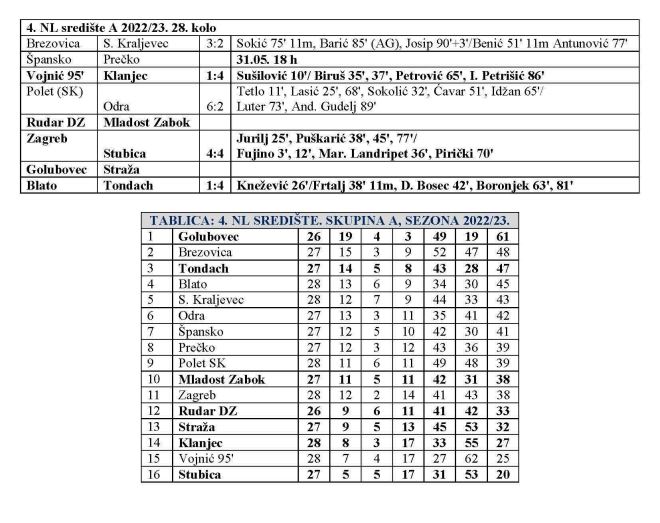 Počelo je 28. kolo 4. NL središte skupina A. Većina utakmica odigrana je danas, no dva zagorska derbija na rasporedu su sutra. Tako će u Dubravi Zabočkoj, zagorski ali i gradski derbi odigrati Rudar DZ i Mladost Zabok. Bit će to vrlo zanimljiva utakmica, jer i jedni i drugi u zadnje vrijeme pružaju vrlo dobre igre. Zanimljiv će biti i drugi zagorski derbi u kojem vodeći Golubovec dočekuje Stražu, koja u zadnje vrijeme igra u sjajnoj formi i niže pobjede protiv ekipa odmah iza Golubovca na ljestvici, pa će biti zanimljivo vidjeti koliko može protiv prvaka. Ostali zagorski predstavnici igraju danas i to u gostima. A danas su na teren izašla tri preostala zagorska predstavnik, svi u gostima i ostvarili su odlične rezultate. Malo je nedostajalo da ubilježe sve tri pobjede. Naime Stubica je vodila kod Zagreba 2:0, 3:1 i 4:3, ali je na kraju ipak odigrala 4:4 i samo ju još teorija ostavlja u igri. No, Klanjec se definitivno vratio u igri. U izravnoj borbi za opstanak Klanjec je sa 4:1 slavio kod Vojnića '95 i spustio ga na predzadnje mjesto, a sebi pružio realnu nadu u zadržavanje statusa sudionika ove lige. U derbiju za vrh tablice, u borbi za drugo mjesto Tondach je u gostima stigao do važne pobjede kod Blata 4:1 i sada ima na trećem mjestu bod manje od Brezovice, koju čeka u srijedu u zaostaloj utakmici. Evo pregleda kola.
