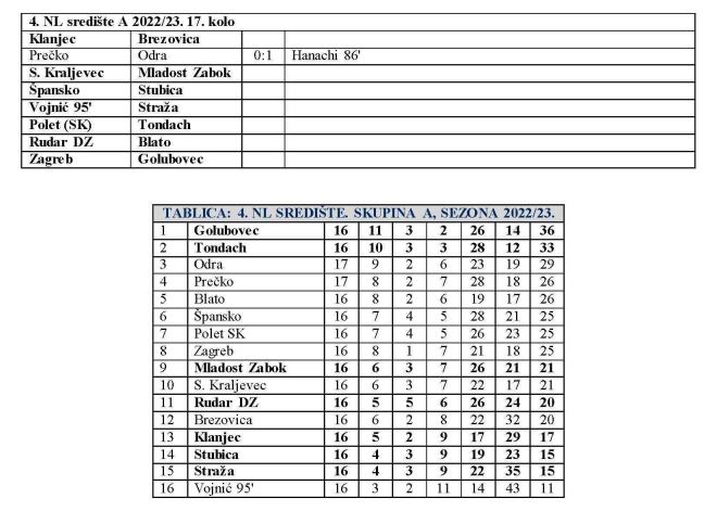 Nakon što u prvom proljetno kolu 4. NL središte skupina A, ni jedan od sedam zagorskih predstavnika nije ostvario pobjedu, pred nama je drugi proljetni nastup, točnije 17. kolo. U ovom kolu nemamo na rasporedu ni jedan zagorski derbi, a samo dva kluba igrat će na domaćem terenu i to oba sutra.