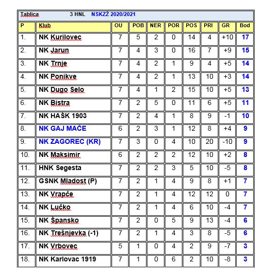Zagorski klubovi imali su polovičan uspjeh. Zagorec je slavio kod kuće protiv Španskog, uz dva nova igrača, vratara Bašića i stopera Prahića i tako je prekinuo “crni niz”. Gaj je pak poražen od Karlovca koji do ovog kola nije imao ni boda i tako je pao na osmu poziciju, dok je Zagorec deveti.