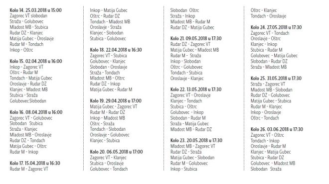 Ovu nedjelju u 15 sati igra se prvo proljetno ili 14. ovosezonsko kolo. Vodeći Tondach gostuje kod predposljednjeg rudara u Mihovljanu. Derbi kola igra se u Humu na Sutli između četvroplasirane Straže i drugoplasiranog Golubovca. Zanimljiv je susret i između šestog Inkopa i trećeg Oštrca koji se igra u Poznanovcu. Još se sastaju: Mladost MB – Stubica, Rudar D – Klanjec i Matija Gubec – Oroslavje. Zagorec VT je slobodan u ovom kolu.