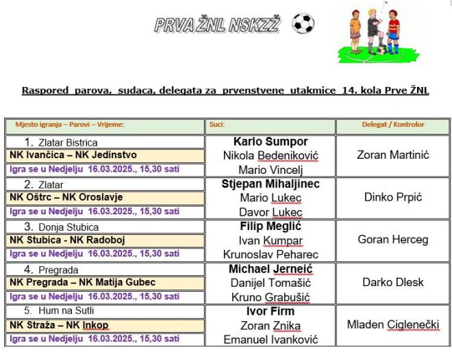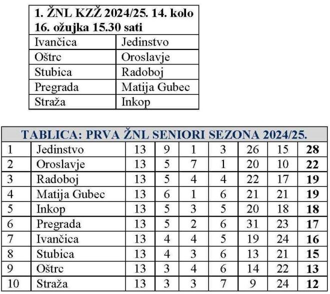 Danas kreće proljetni dio 1. zagorske nogometne lige. Podsjetimo, liga deset i ove sezone donosi trokružni sustav. To znači da ukupno imamo 27 kola, a 13 ih je odigrano u jesenskom dijelu. Bilo je zaista uzbudljivo i zanimljivo. No, koliko se tijekom odvijanja sezone činilo da će u velikoj izjednačenosti, teško neka ekipa isplivati sa 'osjetnijom' bodovnom prednošću, to se ipak dogodilo. Naime, Jedinstvo u proljeće ulazi sa 28 bodova, šest više od Oroslavja i devet više od Radoboja i Matije Gupca. Nije da je to nedostižna prednost, ali kako se Jedinstvo i pojačalo, ima posložene sve kockice, neće moći pobjeći od uloge favorita. Oroslavje je najbliže, na šest bodova i kao najlegitimniji pratitelj kreće u 'lov na Jedinstvo'. A onda, već od trećeg mjesta kreće borba za opstanak. Naime, od trećeg Radoboja do zadnje, desete Straže je sedam bodova razlike i tu nitko nije siguran, barem dok se ne odigra prvih par proljetnih kola. Radoboj i Matija Gubec imaju po 19 bodova, pa slijede Inkop sa 18, Pregrada sa 17, Ivančica sa 16, Stubica sa 15, a na zadnja dva mjesta su Oštrc sa 13 i Straža sa 12 bodova. Vodeće Jedinstvo u prvom proljetnom nastupu gostuje kod Ivančice, a Oroslavje kod Oštrca. U obje utakmice gosti su ti koji traže bodove u borbi za vrh, a domaćinima će svaki bod biti važan u borbi za ostanak. Straža će u proljeće ući sa zadnjeg mjesta utakmicom protiv Inkopa i želi pobjedom krenuti još jače prema opstanku. Zanimljivo će biti u Donjoj Stubici, gdje Stubica dočekuje Radoboj, a u Pregradu dolazi Matija Gubec. Prvo proljetno kolo, 14. po redu igra se u nedjelju 16. ožujka u 15.30 sati.