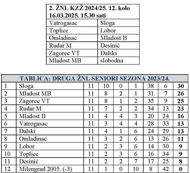 Kreće nam i proljetni dio 2. zagorske nogometne lige. Najbliže naslovu i plasmanu u 1. ŽNL je Sloga, koja je jesenski dio završila sa 30 bodova. Imala je deset uzastopnih pobjeda, a na kraju jeseni, u zaostaloj utakmici stigao je poraz kod Mladosti u Mariji Bistrici. I taj je poraz ostavio kakve takve nade pratiteljima da možda mogu dostići Slogu, no ako će ekipe iz Konjščine biti na jesenskom nivou, to će biti jako teško. Mladost MB zaostaje četiri boda (26), Zagorec VT pet (25), a Rudar M sedam bodova (23). Ako ne 'uhvate' Slogu, ovoj trojci ostaje velika borba za drugo mjesto, jer u pozitivnom raspletu statusa zagorskih predstavnika u 4. NL središte skupina A, moguće je da će i drugo mjesto voditi u 1. ŽNL. Stoga će od početka proljetnog dijela najzanimljivije biti pratiti rezultate vodeće četvorke. Jer Mladost Belec na petom mjestu ima 16 bodova, dakle sedam manje od Rudara M. Dalje slijede Vatrogasac i Đalski sa po 13 bodova, pa Omladinac sa 11, a Lobor i Toplice imaju po devet bodova. Na zadnja dva mjesta su Desinić sa osam i Milengrad 2005. bez bodova. Prvo proljetno kolo, a riječ je o 12. kolu ukupno, ne donosi međusobne susrete vodeće četvorke. Sloga ima ne uvijek jednostavno gostovanje kod Vatrogasca, Mladost MB pak neće na ogled kod zadnjeg Milengrad 2005., jer je Milengrad odustao od natjecanja, Zagorec VT dočekuje Đalski, a Rudar M je domaćin Desiniću. U preostale dvije utakmice sastaju se Toplice i Lobor, te Omladinac i Mladost B. Utakmice se igraju danas u 15.30 sati, osim utakmice Omladinac – Mladost Belec, koja se igra u 18.30 sati na novom igralištu u Velikom Trgovišću.