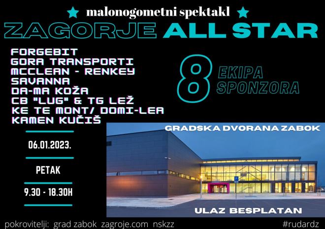 U organizaciji NK Rudar DZ sutra na blagdan „Sveta tri kralja“ u Gradskoj sportskoj dvorani u Zaboku održat će se 2. malonogometni turnir pod nazivom „Zagorje all star“. Idejni začetnik ovog turnira je čelni čovjek Rudara DZ, Mario Videk. Prošlogodišnje, prvo izdanje, bilo je zaista spektakularno, zabočkim su parketom prodefilirala mnoga poznata nogometna imena, a sigurni smo da će tako biti i ove godine. Nastupit će ukupno osam momčadi, a uz branitelja naslova Forgebit, tu su još momčadi Gora transporti, McClean-Renkey, Savanna, DA-MA koža, CB Lug&TG Lež, Ke te mont/Domi-Lea i Kamen Kučiš. Spomenute momčadi bit će podijeljene u dvije skupine.