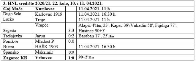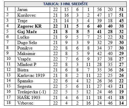 Danas je odigrano 5 utakmica Treće HNL središte, a od dva zagorska predstavnika igrao je Zagorec, koji je u Krapini pobijedio Vrbovec sa 1:0. Zagorec je do pobjede doveo Matija Smrekar s bijele točke u 2. minuti sučeve nadoknade. U ostalim današnjim utakmicama Jarun je sa 2:0 slavio kod Trešnjevke i izbio, barem do sutra na čelo ljestvice. Preostale tri utakmice danas odigrane su bez pobjednika. Segesta i Vrapče igrali su 3:3, a utakmice Ponikve Mladost P i Špansko – Maksimir završile su bez golova. Jarun sada ima 51 bod kao i Kurilovec sa utakmicom manje. Zagorec je na 4. mjestu sa 38 bodova, a Gaj je 5. sa 32 boda i utakmicom manje. Sutra se sastaju Dugo Selo – Karlovac 1919 i Bistra HAŠK 1903. u 16.30, dok će već u 11 sati igrati Lučko i Trnje. No, prava poslastica na rasporedu je u Maču, gdje od 11 sati Gaj dočekuje do danas vodeći Kurilovec.