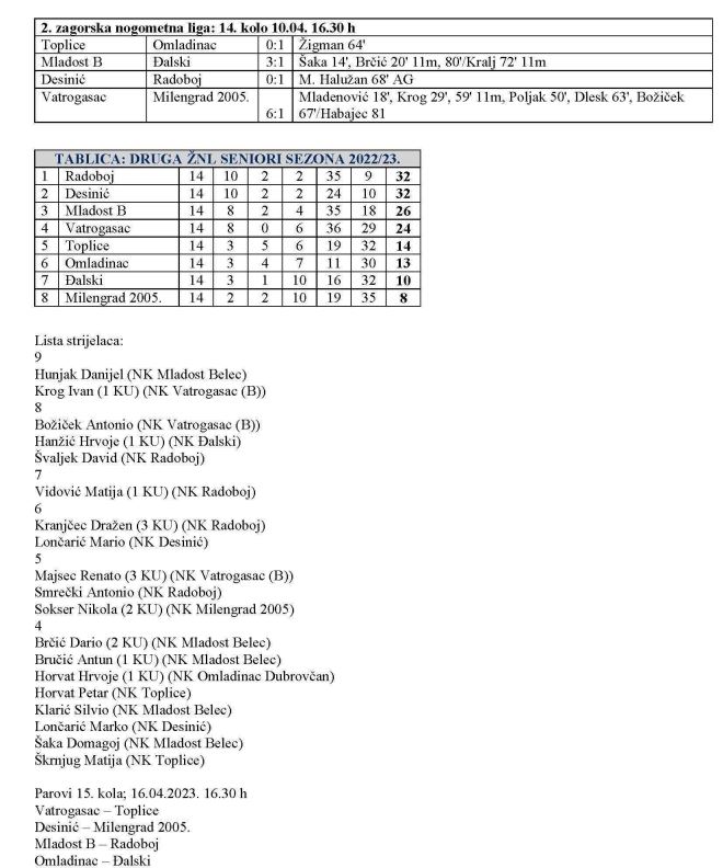 Danas su odigrane preostale tri utakmice 2. zagorske nogometne lige. Podsjećamo, još u subotu u derbiju je Radoboj u gostima svladao Desinić sa 1:0 i vratio se na prvo mjesto sa 32 boda, koliko ima i Desinić. Danas je Mladost Belec sa 3:1 pobijedila Đalski pa se približila vodećoj dvojki na šest bodova. Vatrogasac je sa 6:1 pobijedio Milengrad 2005 i na četvrtom mjestu ima 24 boda. Toplice su ostale na petom mjestu sa 14 bodova, ali im je na bod stigao Omladinac, nakon pobjede u međusobnoj utakmicu u Toplicama. Đalski je tako pao na sedmo mjesto sa 10 bodova, a zadnji je Milengrad 2005. sa 8 bodova. Ovim kolom završio je drugi od tri kruga 2. zagorske lige, tako da nas u 15. kolu očekuje početak trećeg kruga. U njemu se radi novi raspored, a ekipe su dobile brojeve za raspored prema osvojenim mjestima. Tako će u 15. kolu igrati: Radoboj - Milengrad 2005., Desinić - Đalski, Mladost B - Omladinac i Vatrogasac – Toplice. Utakmice se igraju u nedjelju 16. travnja u 16.30 sati. To znači da nas već u 16. kolu 23. travnja čeka derbi vodećih ekipa i to u Radoboju.