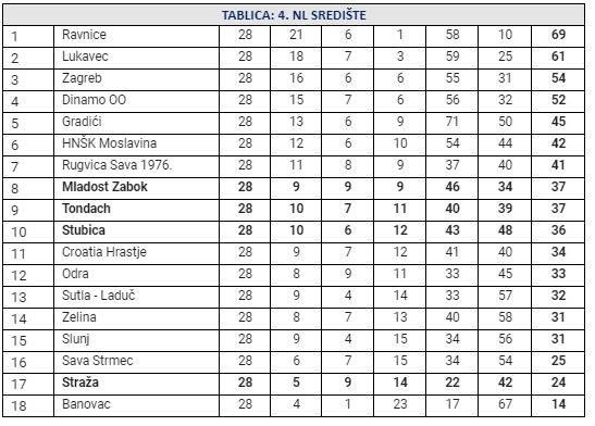 Jučer su odigrane preostale tri utakmice 4. NL središte. U jutarnjem terminu Mladost je u Zaboku ispustila vodstvo 2:0 na poluvremenu, pa je Sulta Laduč stigla do 2:2. Straža je pak u predvečerje gostovala kod Odre i također stigla do boda. Domaćini su poveli u 39. minuti, kada je zabio Luter. No u uzbudljivoj završnici Straža je iz kaznenog udarca u 87. minuti poravnala, a zabio je Marko Pavić. I domaćini su imali penal i to u 2. minuti sučeve nadoknade ali su ga promašili, pa Straža dolazi do boda. Ovim bodom Mladost se podignula na 8. mjesto, sa 37 bodova, koliko ima i 9. Tondach, dok je Stubica na 10. mjestu sa bodom manje. Straža je nakon ovog kola na 17. mjestu sa 24 boda. Naime u 3. današnjoj utakmici Sava Strmec je sa 5:2 slavila kod Moslavine pa je preskočila Stražu U 29. kolu Straža dočekuje Zagreb, Stubica Zelinu, a Tondach Croatiu Hrastje, dok će Mladost u goste Gradićima. Evo rezultata 28. kola, strijelaca i ljestvice.