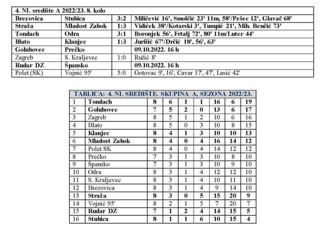 Danas je odigrano šest od osam utakmica 8. kola 4. NL središte skupina A. U zagorskom derbiju u Humu na Sutli Mladost Zabok je sa 3:1 svladala domaću Stražu. Do vrlo vrijednih pobjeda stigli su Tondach i Klanjec. Tondach je kod kuće pobijedio Odru sa 3:1 i izbio na vodeće mjesto lige, barem do sutra. Klanjec je pak u gostima svladao Blato, također 3:1 uz hat trick Drčića. Blato je prije ovog kola bilo odmah iz zagorskog dvojca na vrhu. Stubica je pak još jednom poražen, opet tijesno na teškom gostovanju. Brezovica je bila bolja 3:2. Zagreb je danas još sa 1:0 pobijedio Sesvetski Kraljevec, dok je Polet (SK) sa 5:0 bio bolji od Vojnića 95'. Vodstvo je na ljestvici preuzeo Tondach sa 19 bodova, a samo ga Golubovec može vratiti sutra, u slučaju pobjede protiv Prečkog. Golubovec ima 17 bodova. Klanjec se popeo na 5. mjesto sa 13 bodova, a Mladost Zabok na 6. sa 12 bodova. Straža je pala na 13. mjesto sa 9 bodova, a na začelju su Rudar DZ i Stubica, s tim da Rudar DZ sutra ima još utakmicu protiv Španskog.