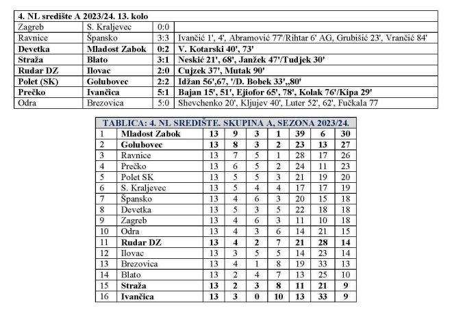 Za nama je 13. kolo u 4. NL središte skupina A, kolo bez zagorskih derbija i kolo nakon kojega je Mladost Zabok ostala na čelu i to sada sa tri boda prednosti. Naime, Mladost je sa 2:0 slavila kod Devetke i sada je na 30 bodova. Pratnja Mladosti odigrala je neodlučeno. Golubovec je u Svetoj Klari kod Poleta odigrao 2:2, uz velike prigovora Golubovčana na suđenje. No, Ravnice su doma odigrale 3:3 protiv Španskog. Tako je Golubovec ostao drugi sa 27 bodova, a Ravnice treće sa 26. Rudar DZ je stigao do jako vrijedne pobjede, 2:0 protiv Ilovca i popeo se na 11. mjesto sa 14 bodova. Straža je stigla do također važne pobjede, 3:1 protiv Blata, iako je utakmica zbog tučnjave izvan terena prekinuta u 83. minuti, vjerujemo da se rezultat neće 'dirati'. Time je Straža skočila na predzadnje mjesto sa 9 bodova, koliko ima i zadnja Ivančica koja je još u petak poražena kod Prečkog 1:5. U 14. kolu na rasporedu je jedan zagorski derbi. Mladost će u Zaboku u nedjelju u 10 sati dočekati Stražu. U subotu će na teren dva zagorska predstavnika. Golubovec će u 13.30 sati dočekati Prečko, dok Rudar DZ u isto vrijeme gostuje kod Blata u važnoj utakmici borbe za opstanak. Zadnja će na teren od zagorskih predstavnika u 14. kolu Ivančica, koja će u nedjelju dočekati Odru.