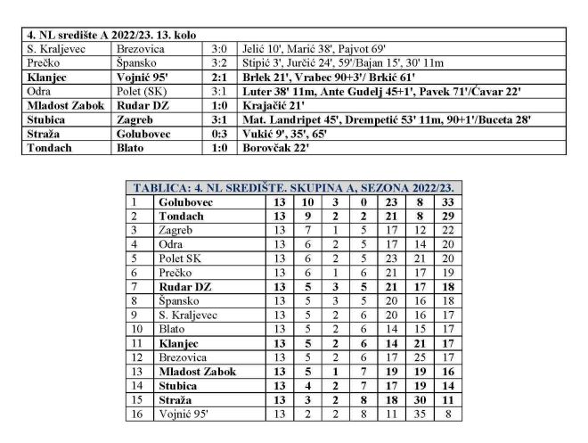 Danas su odigrane preostale četiri utakmice 4. NL središte skupina A. Još prijepodne gradski zabočki derbi dobila je Mladost Zabok 1:0 protiv Rudara DZ, a poslijepodne do vrlo vrijednih pobjeda stigli su Klanjec i Stubica. Klanjec je u 3. minuti sučeve nadoknade stigao do super važne pobjede protiv zadnjeg Vojnića 95', a Stubica je preokretom pobijedila treći Zagreb sa 3:1. Golubovec vodi sa 33 boda, Tondach ima 29. Treći Zagreb za Tondachom zaostaje sedam bodova, a za Golubovcem čak 11. U ovako izjednačenoj ligi, ne treba naglašavati koliko je zapravo sjajan rezultata vodeće zagorske dvojke, posebno naravno Golubovca, koji nema poraz. Rudar DZ je na sedmom mjestu sa 18 bodova, Klanjec je 11. sa 17 bodova, Mladost Zabok 13. sa 16, a Stubica 14. sa 14 bodova. Koliko su male razlike govori podatak da Stubica za 4. mjestom zaostaje samo šest bodova. Straža ima 11 bodova na 15. mjestu. U 14. kolu opet su na rasporedu dva zagorska derbija i to oba u isto vrijeme u nedjelju u 13.30 sati. U Novom Golubovcu sastaju se dvije vodeće momčadi lige, Golubovec dočekuje Tondach. Utakmica je to koju ne treba posebno i najavljivati. Podsjećamo, razlika je četiri boda u korist Golubovca U isto vrijeme u Dubravi Zabočkoj Rudar će dočekati Stubicu. Preostala tri zagorska predstavnika su u gostima i to u subotu. Straža će već od 11 sati igrati kod Zagreba, a u 13.30 Mladost Zabok gostuje kod Poleta (SK), a Klanjec kod Španskog.