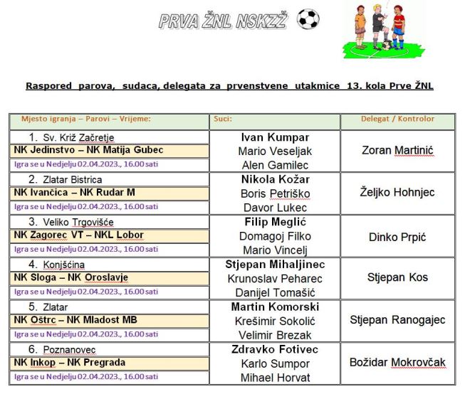 Nastavljaju se danas uzbuđenje u 1. zagorskoj nogometnoj ligi. U 13. kolu vodeća petorka nema međusobnih susreta, a ostaje vidjeti hoće li baš svi biti uspješni. Pregrada će na drugo uzastopno gostovanje i to kod Inkopa, a Jedinstvo će pak drugi puta zaredom igrati doma, ovaj puta protiv Matije Gupca. Oštrc dočekuje Mladost MB, a Ivančica Rudar M, dok će Oroslavje na gostovanje kod Sloge. Zagorec VT dočekuje Lobor. Utakmice su na rasporedu u 16 sati.
