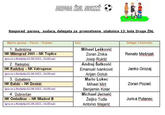 Danas su na rasporedu utakmice 13. kola 2. zagorske nogometne lige. U 13. kolu vodeći Radoboj će dočekati Vatrogasca, dok će Desinić na gostovanje Đalskom. Drugo uzastopno gostovanje Mladost B će odraditi kod Omladinaca, dok se u Budinščini sastaju Milengrad 2005. i Toplice. Utakmice se igraju u 16 sati.