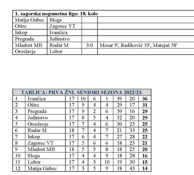 Danas je na rasporedu preostalih pet utakmica 18. kola 1. zagorske nogometne lige. Naime, već u četvrtak odigrana je utakmica u Mariji Bistrici, u kojoj je Mladost MB sa 3:0 pobijedila Rudar iz Mihovljana. Važna je to pobjeda Mladosti u borbi za opstanak. Inače, još u srijedu istom je rezultatom Inkop slavio kod Zagorec VT u zaostaloj utakmica 17. kola. A rasplet 18. kola na rasporedu je danas. Vodeća Ivančica gostuje kod susjeda Inkopa u Poznanovcu, a derbi će u Pregradi odigrati Pregrada i Jedinstvo. Zanimljivo bi moglo biti i u Zlataru, gdje Oštrc dočekuje Zagorec VT. U borbi za opstanak Matija Gubec dočekuje Slogu. Oroslavje će pak dočekati Lobor. Utakmice počinju u 17 sati.