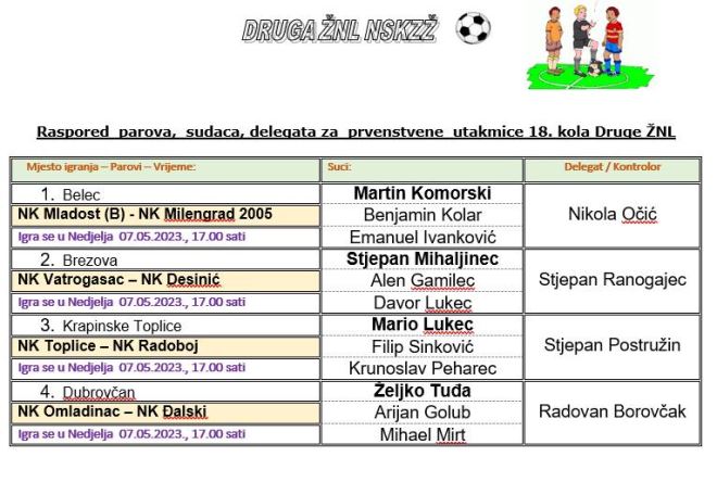 Danas je na rasporedu i 18. kolo 2. zagorske lige. U 18. kolu vodeći Radoboj će gostovati kod Toplica, a derbi će igrati Vatrogasac i Desinić. Mladost Belec dočekuje zadnji Milengrad 2005., dok će se u Dubrovčanu sastati susjedi na ljestvici i u prirodi Omladinac i Đalski. Utakmice se igraju 17 sati.