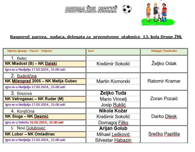 Pred nama je 13. kolo 2. ŽNL. U derbiju Vatrogasac će dočekati Rudar M, dok vodeći Matija Gubec gostuje kod Milengrada 2005. Mladost B bit će domaćin Đalskom, Sloga Desiniću, a Lobor Omladincu. Slobodne su Toplice. Utakmice se igraju sutra u 15 sati, osim utakmice u Konjščini koja se igra već danas, također u 15 sati. .