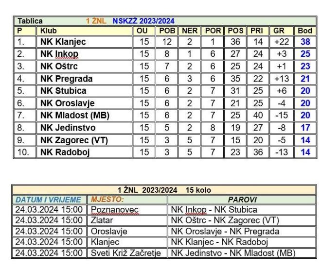Danas je na rasporedu i 16. kolo 1. zagorske nogometne lige. Izdvajamo derbi u kojem će Inkop dočekati Stubicu. Vodeći Klanjec dočekat će Radoboj, Oštrc je domaćin Zagorcu VT, a Oroslavje – Pregradi. Jedinstvo će pak u utakmici važnoj za opstanak dočekati Mladost MB. Zapravo u borbi za opstanak važne su sve utakmice. Početak svih susreta je u 15 sati.