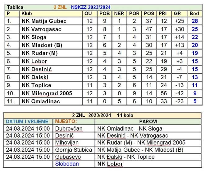 Pred nama je i 14. kolo 2. ŽNL. U derbiju u Gornjoj Stubici, Matiji Gupcu u goste dolazi Mladost Belec. No, po rezultatima u proljetnom dijelu, domaćini su favoriti. Vatrogasac će pak na gostovanje kod Desinića, a Rudar M dočekuje Milengrad 2005. Đalski će u Gubaševom dočekati Toplice, dok će Omladinac biti domaćin Slogi. Slobodan će biti Lobor. Utakmice se igraju također danas u 15 sati