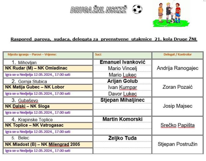 Što se pak tiče druge zagorske lige, na rasporedu je 21. kolo. Vodeći Matija Gubec dočekat će Lobor, Vatrogasac gostuje kod Toplica, a Sloga kod Đalskog. Rudar M bit će domaćin Omladincu, a Mladost B će dočekati Milengrad 2005. Slobodan je Desinić Utakmice se igraju od 17 sati.