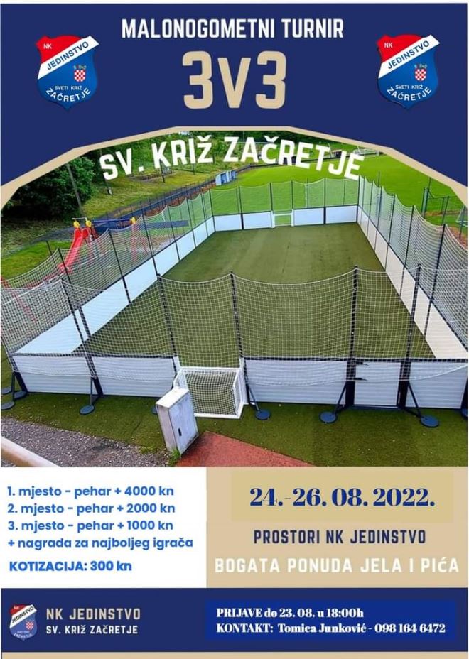 U sklopu brojnih događanja slijedećega tjedna u Svetom Križu Začretju izdvajaju se i dva nogometna i to u organizaciji NK Jedinstvo. Tako je se od 22. do 26. kolovoza na rasporedu 2. dječji festivalski turnir, na kojem će igrati prstići, zagiči i limači. Kontakt za prijave je Darko Kunštek (0917645662). Kotizacija je 500 kn.