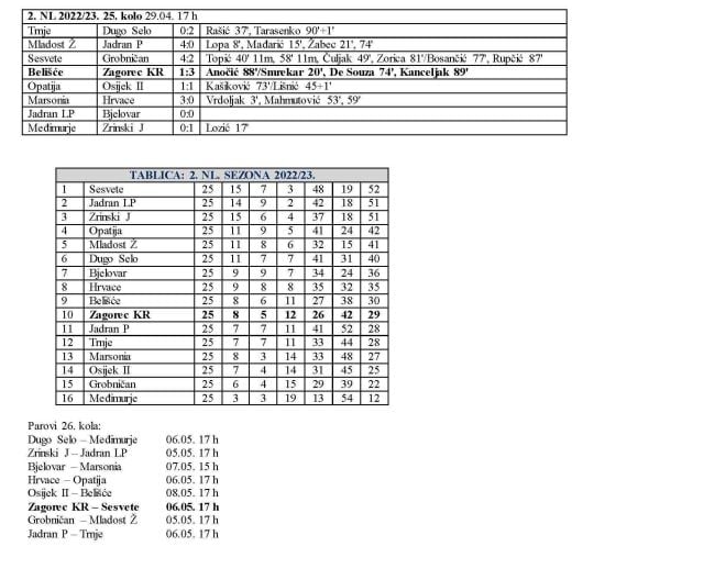 U 25. kolu Druge SuperSport nogometne lige krapinski Zagore gostovao je kod Belišća i upisao pobjedu od 3:1 te time nastavio svoj pozitivan niz od sedam utakmica bez poraza.